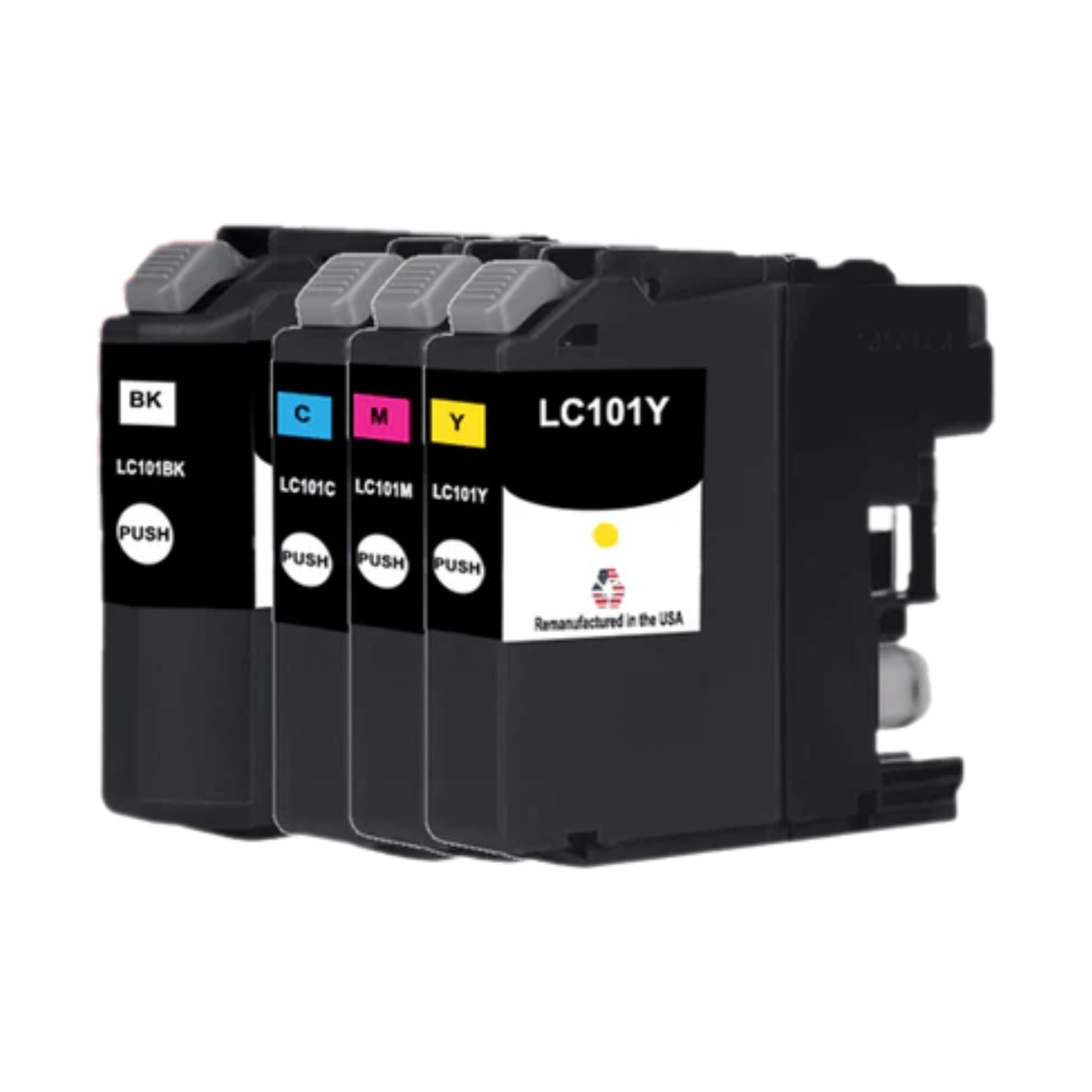JIT remanufactured Brother LC101BK black and 3 color combo pack ink cartridges are the highest quality replacement ink cartridges on the market. Using only original Brother LC101BK, LC101C cyan, LC101M magenta and LC101Y yellow cartridges, we remanufacture each cartridge to the highest quality standards to match OEM ink level, color, and performance guaranteed!