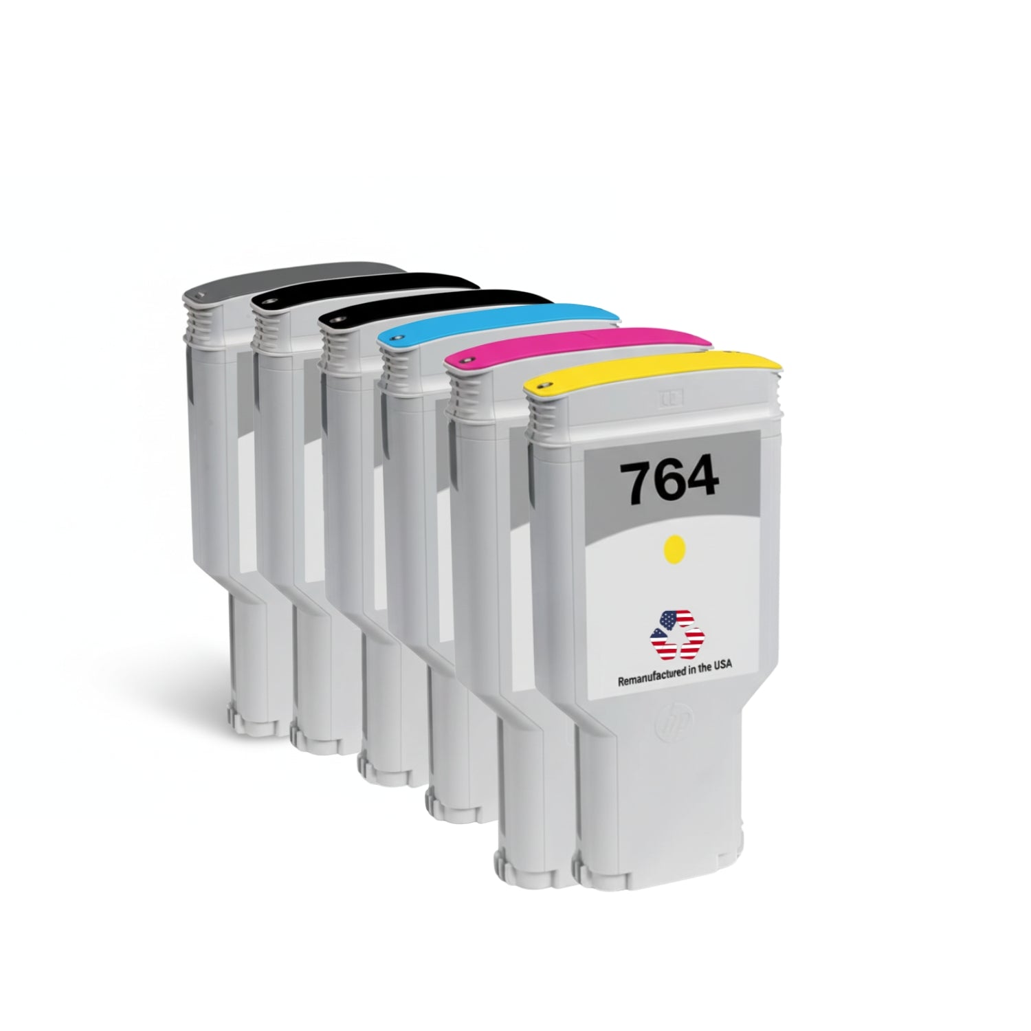 JIT Brand for HP 764 300mL Multi-color Remanufactured in the USA Ink Cartridge-6-Pack Ink cartridges are the highest quality wide format replacement ink cartridges on the market. Using only original HP 764 300mL Black (C1Q16A), Grey (C1Q18A), Yellow (C1Q15A), Magenta (C1Q14A), Cyan (C1Q13A), Photo black (C1Q17A). We remanufacture each cartridge to the highest quality standards to match OEM ink level, color, and performance guaranteed!